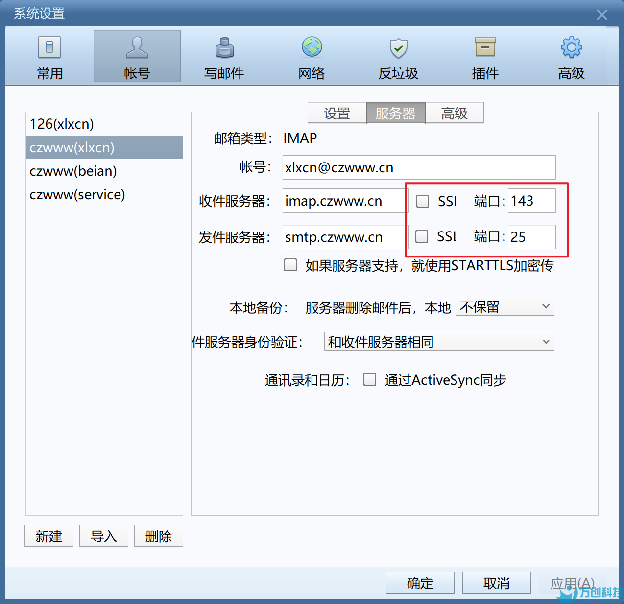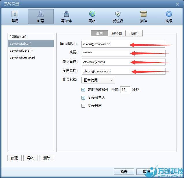 發(fā)件服務器也是固定格式,如:smtp.czwww.cn,czwww.cn是自己企業(yè)郵箱的后綴,此信息由我們提供。輸入時需要輸入完整的收件服務器。