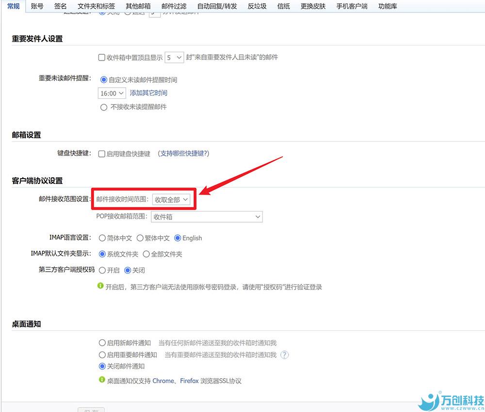 第二步:找到“客戶端協(xié)議設(shè)置”,將對應(yīng)“郵件接收時(shí)間范圍”后面的“30天”改成“全部”后保存設(shè)置。