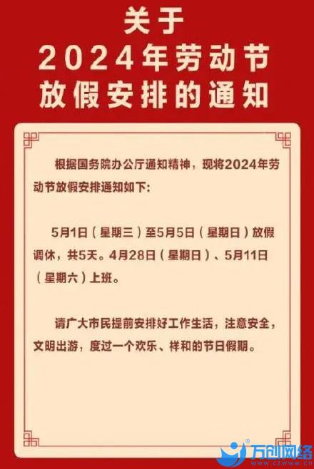 根據(jù)國(guó)務(wù)院辦公廳通知精神,我司現(xiàn)將2024年勞動(dòng)節(jié)放假安排通知如下: